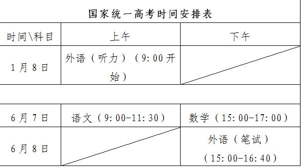国家统一高考科目使用全国统一命题试卷,考试时间安排在6月7日全天和6月8日下午,其中语文考试时间为150分钟,数学考试时间为120分钟,外语(笔试)考试时间为100分钟。外语(听力)考试安排在1月8日上午,连续组织两次,每次考试时长约20分钟,考试成绩取两次中的高分计入外语科目成绩。
