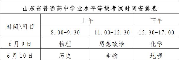 普通高中学业水平等级考试由山东省自主命题,考生从思想政治、历史、地理、物理、化学、生物等6个科目中选报3科参加考试。考试时间安排在6月9日-10日,每科考试时间为90分钟。