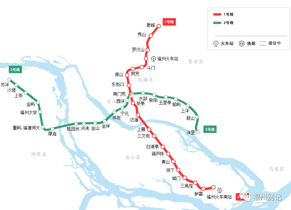 福州地铁2号线已开通站点及换乘:苏洋站、沙堤站、上街站、金屿站、福州大学站、董屿·福建师大站、厚庭站(换8号线)、桔园洲站、洪湾站、金山站(换5号线)、金祥站、祥坂站、宁化站、西洋站、南门兜站(换1号线)、水部站、紫阳站(换3号线)、五里亭站、前屿站(换4号线)、上洋站、鼓山站、洋里站。