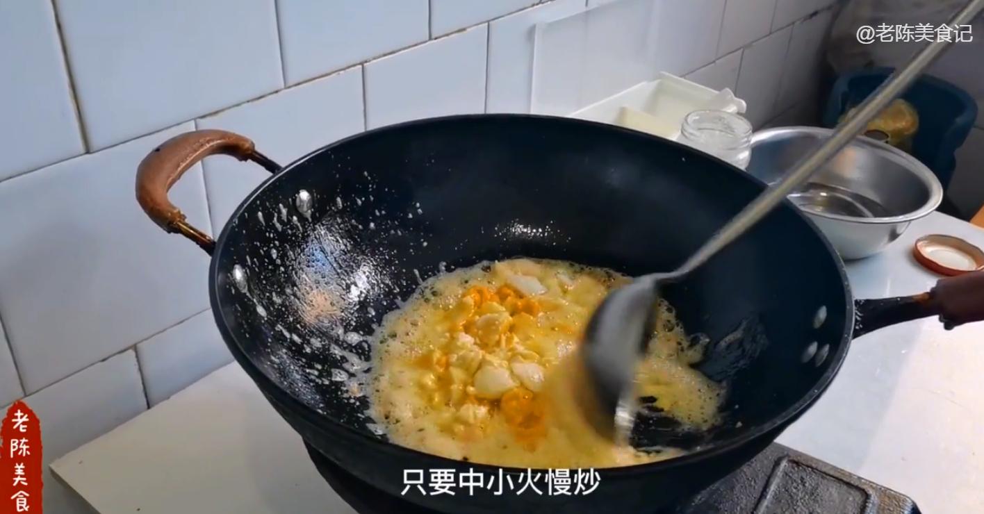 起锅烧油,把压碎的咸鸭蛋放入锅中,中小火慢炒,用勺子慢慢地推动一下。大约炒一分钟,把咸鸭蛋的香味炒出来。