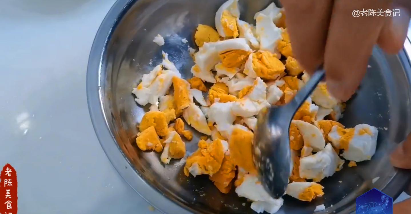 先来把咸鸭蛋处理一下,把它的外皮剥掉。剥好的咸鸭蛋,用勺子把它压碎,这样炒的时候比较好入味。