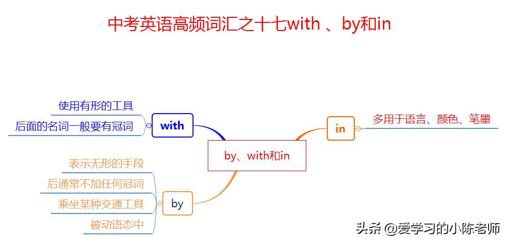 2.by,用来表示无形的手段,指的是抽象的方法或凭借的动作。后通常不加任何冠词。