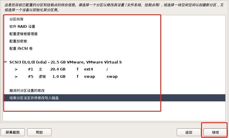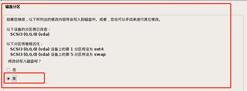 一定要选择结束分区设定并将修改写入磁盘项,下图默认是否不写入磁盘,如果选择否,安装完后,系统就不能自行启动了,所以一定要选择是,写入磁盘。