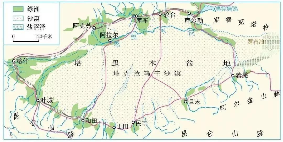 为什么会出现这样的规律呢?塔里木盆地、准噶尔盆地、柴达木盆地都好解释,因为这三大盆地中心都是沙漠戈壁等不利于人类居住的区域,以塔里木盆地为例,在塔里木盆地的中部形成了我国最大的沙漠,塔克拉玛干沙漠,所以在塔里木盆地生存,水源成了最为关键的因素。塔里木盆地地区最为主要的水源来源就是天山和昆仑山上的冰川融化水,由于气候干旱,冰川融水量也不是很大,形成的河流往往流程较短,很难深入盆地中心。盆地边缘是高山山麓地带,发育有冰川融水形成的内流河,在高大山脉的山麓冲积扇地区,就成为了首选之地,一方面河流水源较为充足,同时地形较为平坦,土壤肥沃,多形成绿洲,可以发展种植业,被称为“绿洲农业”。有着良好的农业生产条件,就有了人口聚居的条件,也就形成了很多聚落的分布,形成城镇集中。