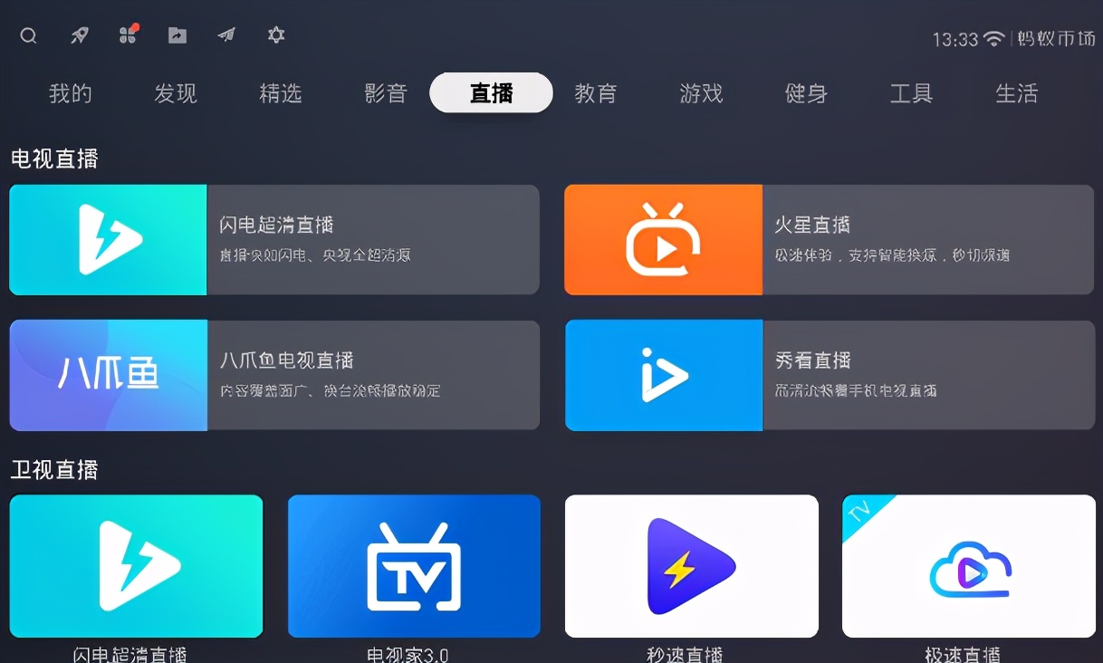 电视家系列、八爪鱼电视直播、火星直播、超级万能直播等,聚合类电视直播软件,可以观看电视剧、现场直播、综艺等,卫视地方台频道栏目节目全面、高清流畅等特点,适用于智能投影仪、智能电视、网络机顶盒等