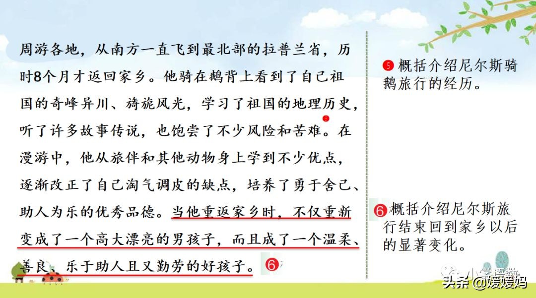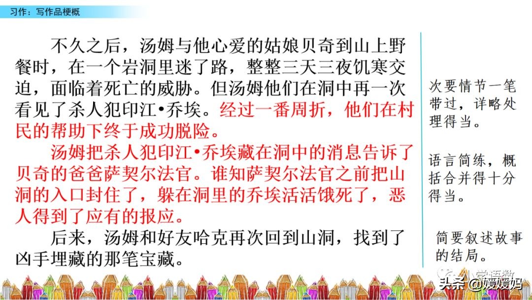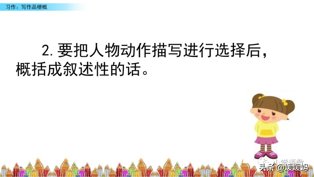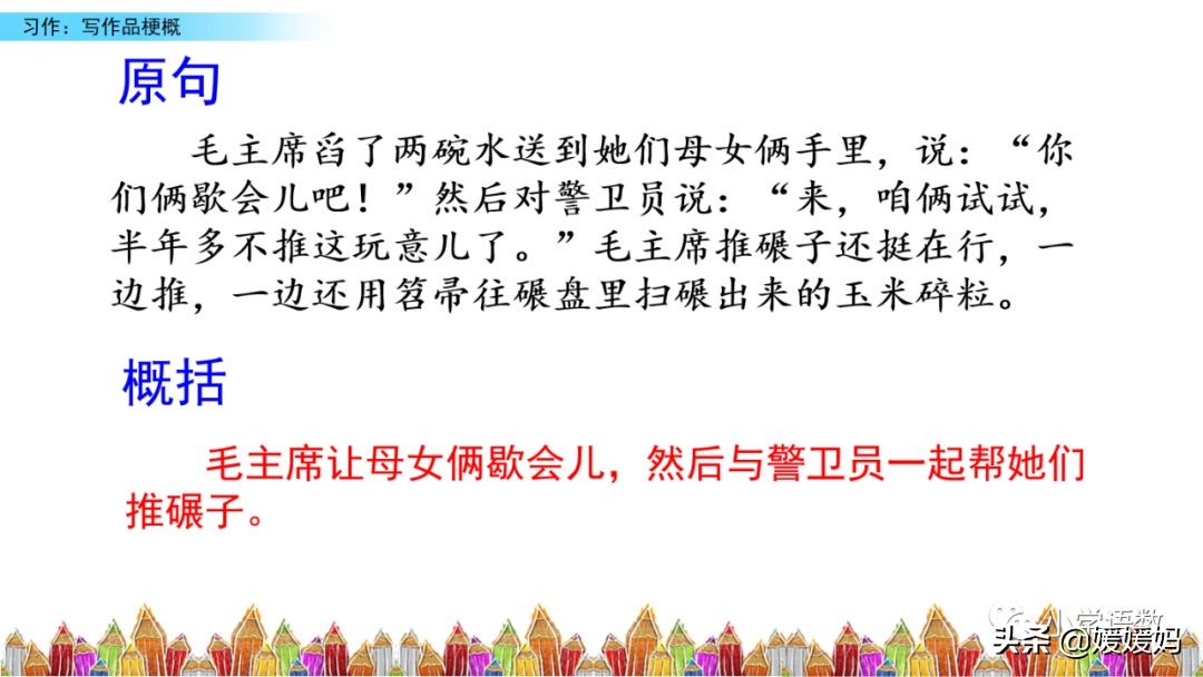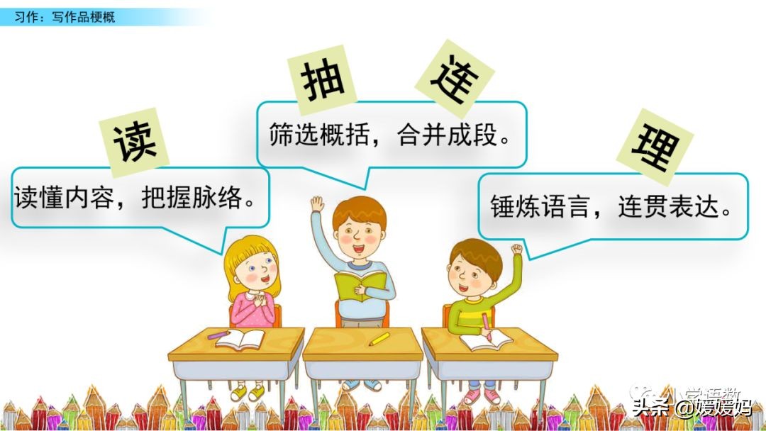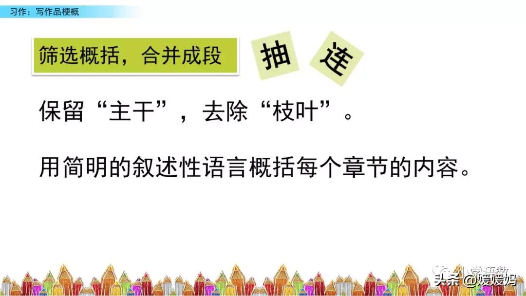 2、精选概括,合并成段。保留“主干”,去除“枝叶”。用简明的叙述性的语言概括每个章节的内容。