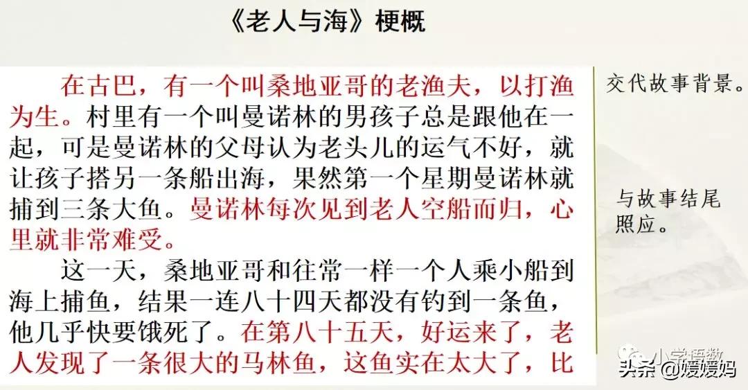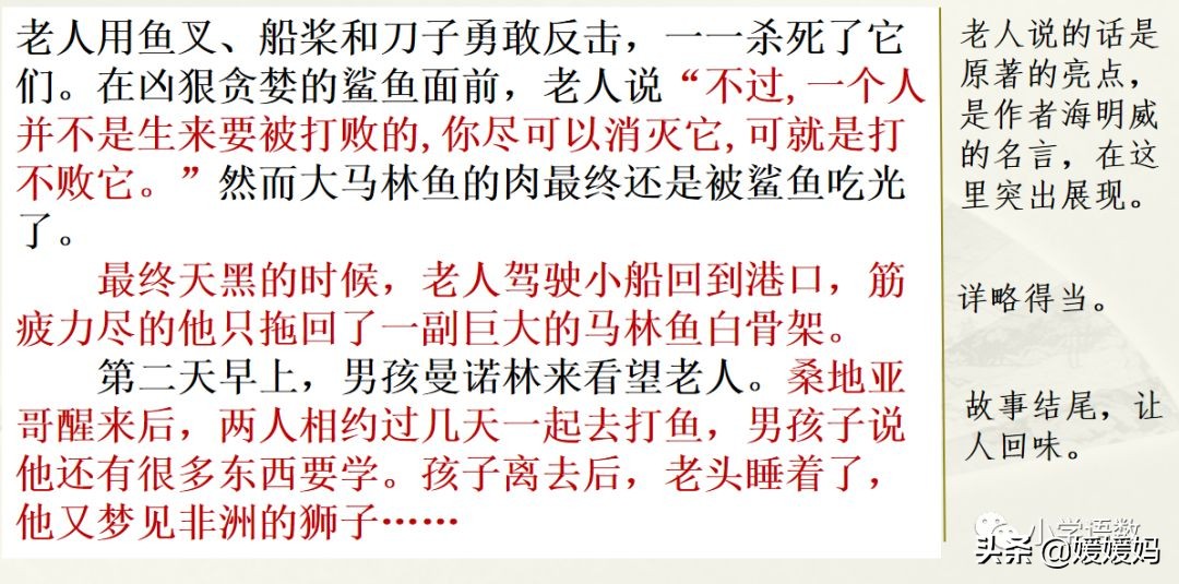 子夜时分,老人终于驶进小港,回到他的小茅棚。天亮后,当人们对着那大鱼的骨架发出惊叹的时候,曼诺林送来了热咖啡,并告诉老人,以后和他一起出海。