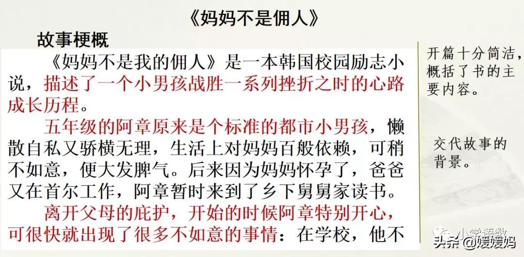 《妈妈不是我的佣人》是一本校园励志小说,讲述了一个小男孩战胜一系列挫折的心路成长历程。