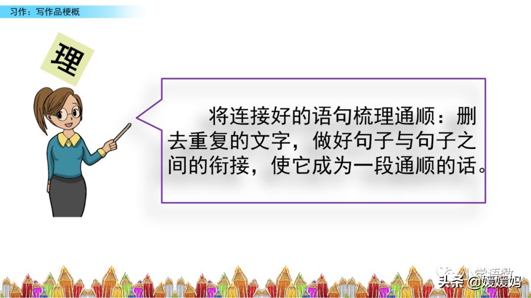 第四步:理。将连接好的语句梳理通顺:删去重复的文字,做好句子与句子之间的衔接,使它成为一段通顺的话。