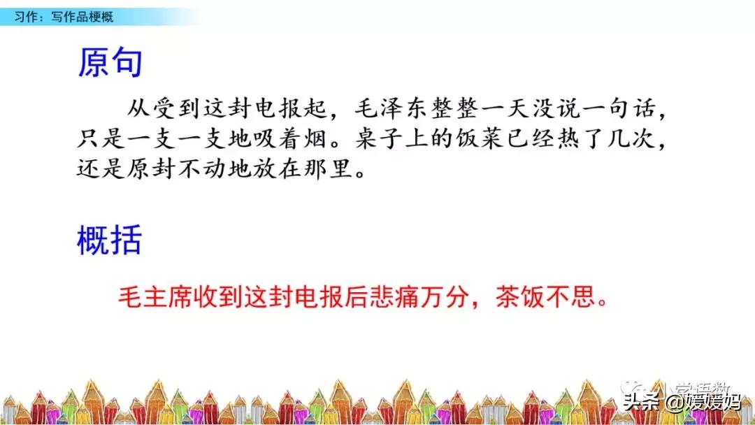第二步:抽。在理解原文的基础上,抽取出原文各段的段落大意。需要强调的是对一些描写具体或是富含情感的关键段落要注意适当保留原句;对一些简短的、不影响文章表达的次要段落则大胆地取舍。