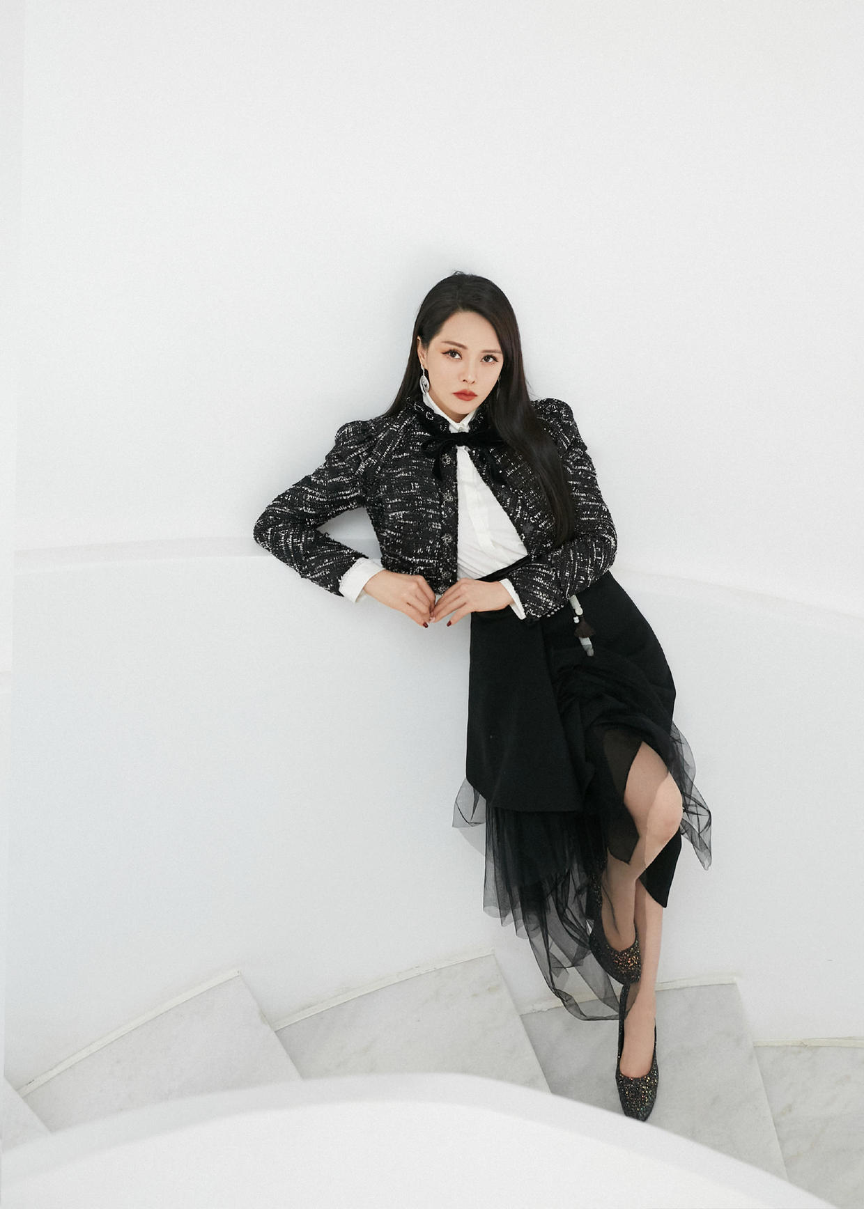 黑色拖地薄纱礼服就带有更多的优雅高贵气质了,肩部采用了去年大火的泡泡袖设计,同样也是薄纱面料,拖地蛋糕裙摆一层一层地特此有设计感。黑色真的是太显瘦,也太修饰个人气质了,伊能静的气场也太强了!