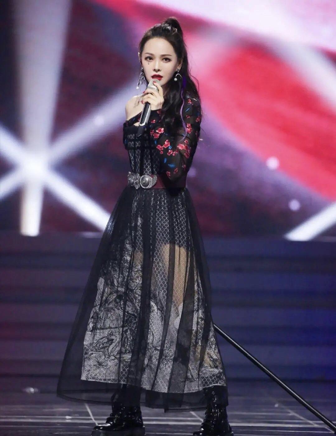 黑色薄纱连衣裙简洁而又干练,带有旗袍款式和设计,同时下摆嵌入了半透视薄纱,性感和优雅都有,搭配黑色马丁靴,这个身材和状态真的是好极了。