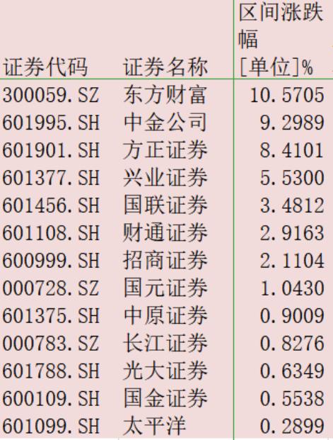 据同花顺iFinD统计显示,在本周的股价走势排名中,东方财富上涨10.57%,位居第一;中金公司、方正证券分别上涨9.29%和8.41%,位居第二和第三。