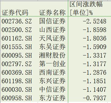 跌幅榜上,国信证券下跌2.52%,山西证券和天风证券分别下跌超过1.8%,位居第二和第三。