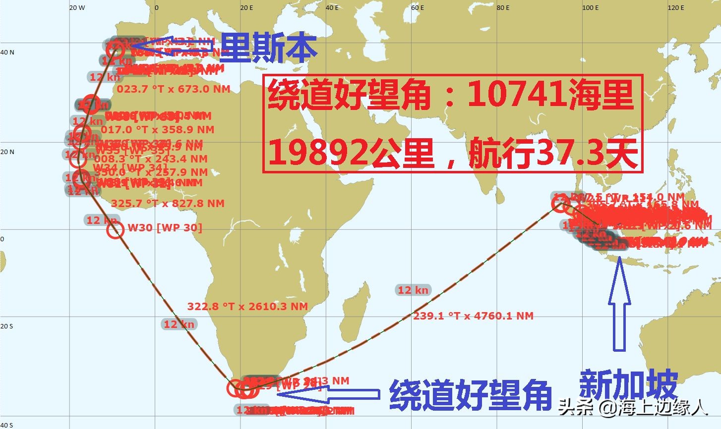首先咱看看绕道好望角,新加坡出去,通过马六甲海峡,然后向西南跨过印度洋,到达南非南,然后沿着非洲大陆北上,到达里斯本,全程10741海里,差不多19892公里,按照满载经济航速12节计算,要航行37.3天。值得注意点的是西非海盗猖獗,注意安全。