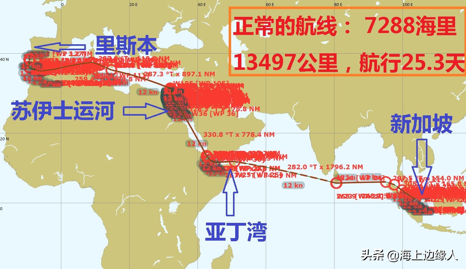 以我们船为例,从新加坡前往里斯本的航线,这里先普及下,海上计算距离都是用海里,1海里约等于1852米。动车高铁速度一小时250公里,那么船舶航速怎么表示呢?其实航速一般用节来表示,1节等于一小时跑1海里,就是1.852公里,所以高铁速度250KM/H就等于135节的速度,目前轮船没有谁能达到这个速度,客轮和军舰一般速度比较快,差不多能跑30节,才相当于60公里每小时的速度不到,也就是我们之前做过那种绿皮车的速度,可以打开火车窗户那种绿皮车,没有空调的,站台如果人多挤不进去火车,大家可以从窗户爬进去,我之前有爬过。扯远了,现在继续我们的话题。