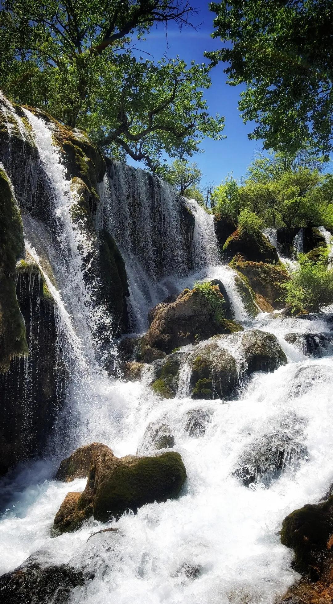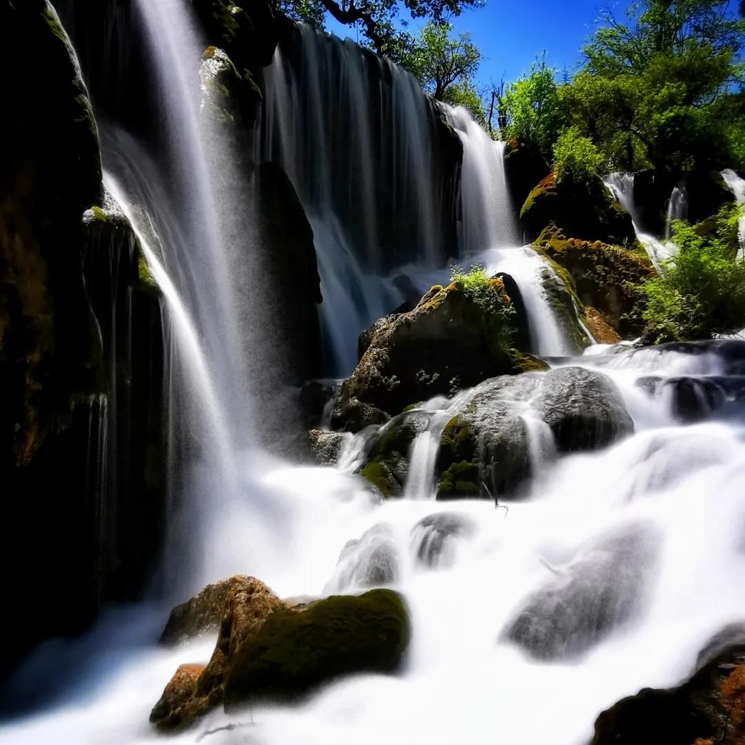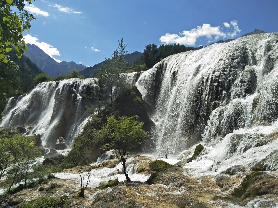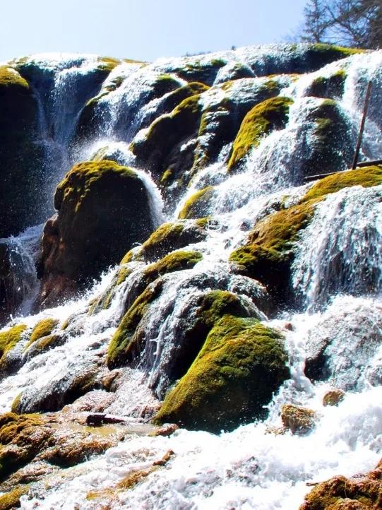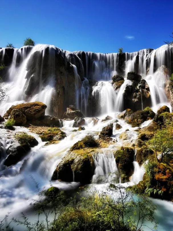 湍流、滩流和瀑布群相联,珠联玉串。诺日朗的上方是平坦的海子群,遇到高落差的地势,又奔腾下来,动静结合,蔚为壮观,不得不感叹大自然鬼斧神工,妙笔绘佳景。隔着屏幕看九寨沟,不如来九寨感受真实的蓝天白云,壮观飞瀑。