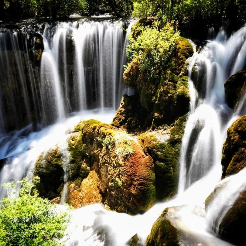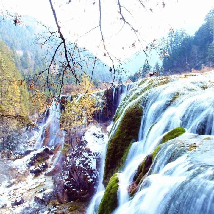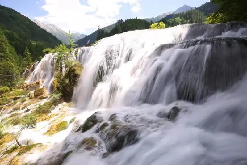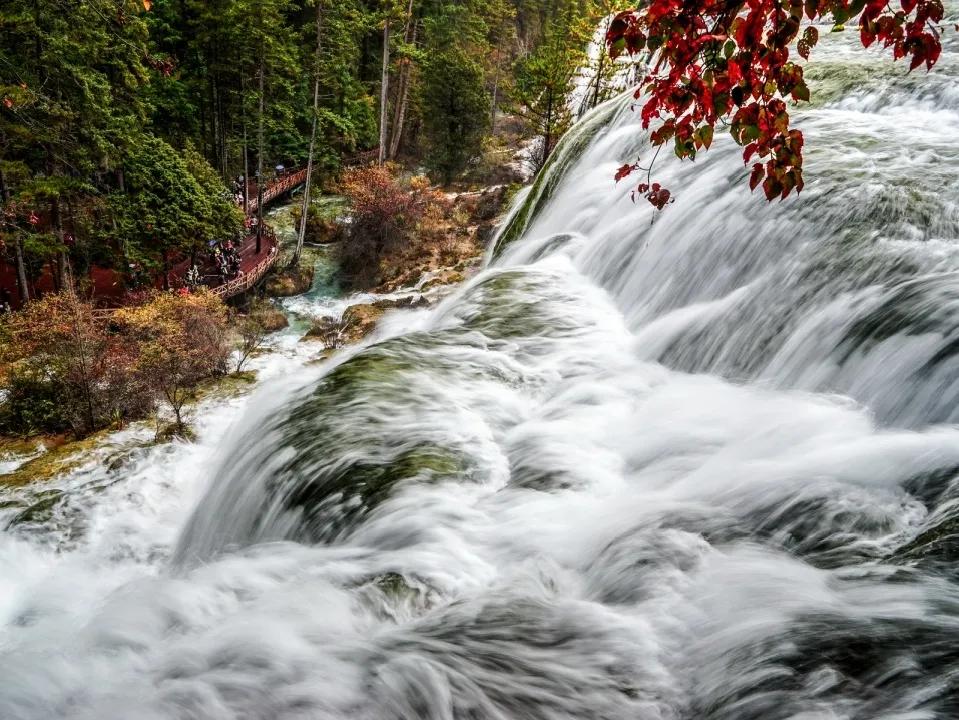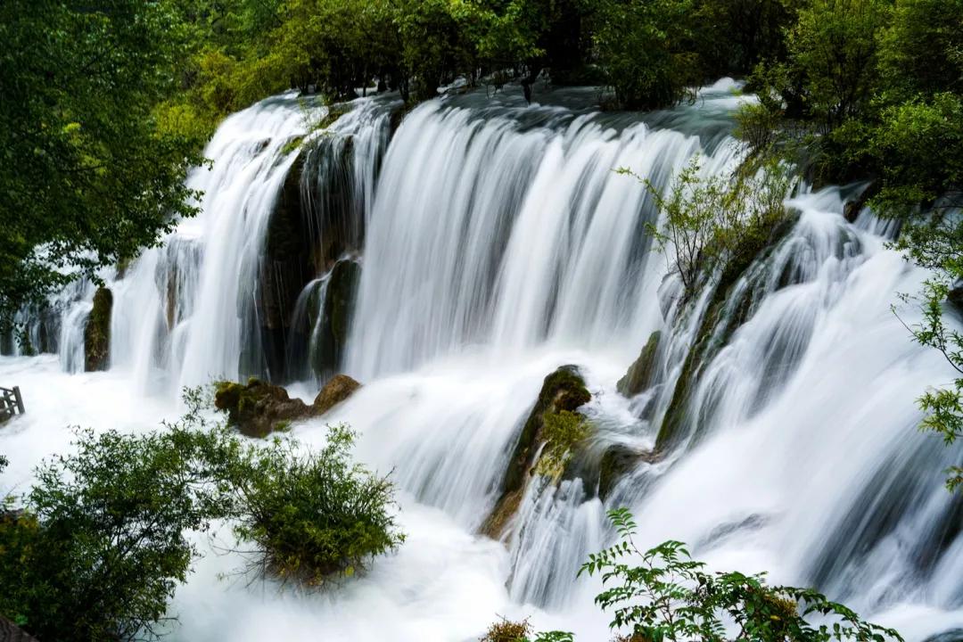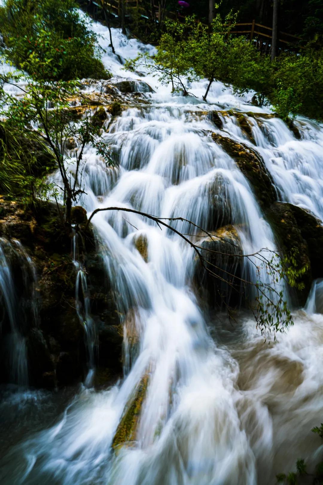 九寨沟的瀑布因地而适,高低落差姿态各异。雪山融化、吸收的雨水,从高处流下,时而奔腾,时而涓涓,时而水花飞溅,时而环抱林木。飞瀑层层叠叠,相衔相依,形成了绿白分别又相融的奇景,使人听觉、视觉、感觉为之协调的意境当中,陶醉在享受美好的场景中,徜徉在九寨沟动态“水势”当中,满足身心的一切需求。