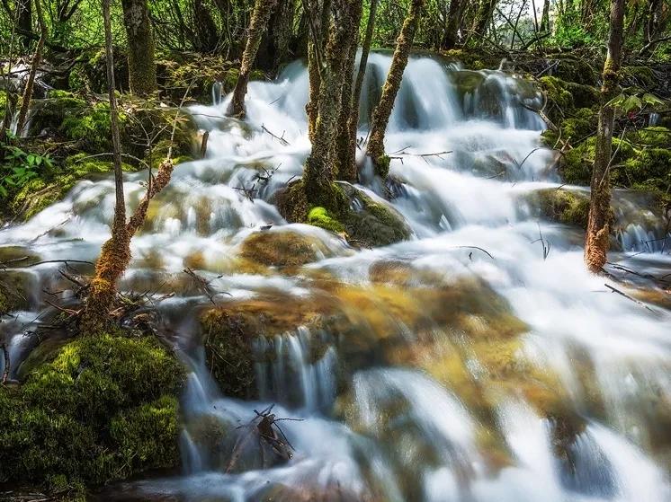 滔滔激流,涓涓飞泉,层层烟雾,阵阵涛声,不绝于耳,这是“瀑布王国”。九寨沟的水景,主要是由喀斯特溶蚀作用影响,流域当中岩石几乎都是由石灰岩构成,岩石的构成中有大量的裂隙,增大了额岩石的透水性,在高落差的水流冲击下,有利于岩溶水的循环,使得喀斯特作用一直存在,且增大了流域的植被发育,在岩溶水流动过程中,较平缓的地方沉淀下来,将地势堆高,从高台冲刷下来的水流,不断的冲击侵蚀着瀑布的低地,形成了这些有着高低落差的瀑布,也形成了“水在林间流,林在水中长”的奇观。