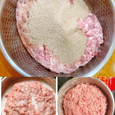 3、绞好的肉加入调料拌匀,然后用100毫升清水加淀粉再次拌匀,腌制半小时入味。 这个时候可以把棉线剪成小段备用。