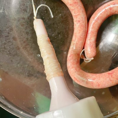 4、开始灌肠,洗好的肠衣可以用温水泡一下,这样肠衣热胀冷缩,肠衣更容易套进灌肠口。 把肉装进灌肠器,肠衣末端用线扎死结,慢慢摇转灌肠器把手,(这里一定要注意边摇转把手边把肠衣往下面慢慢推动,不然肠衣一下就爆口了)把手转动同时肉往肠衣下滑,只要不爆肠,很快就装好了。