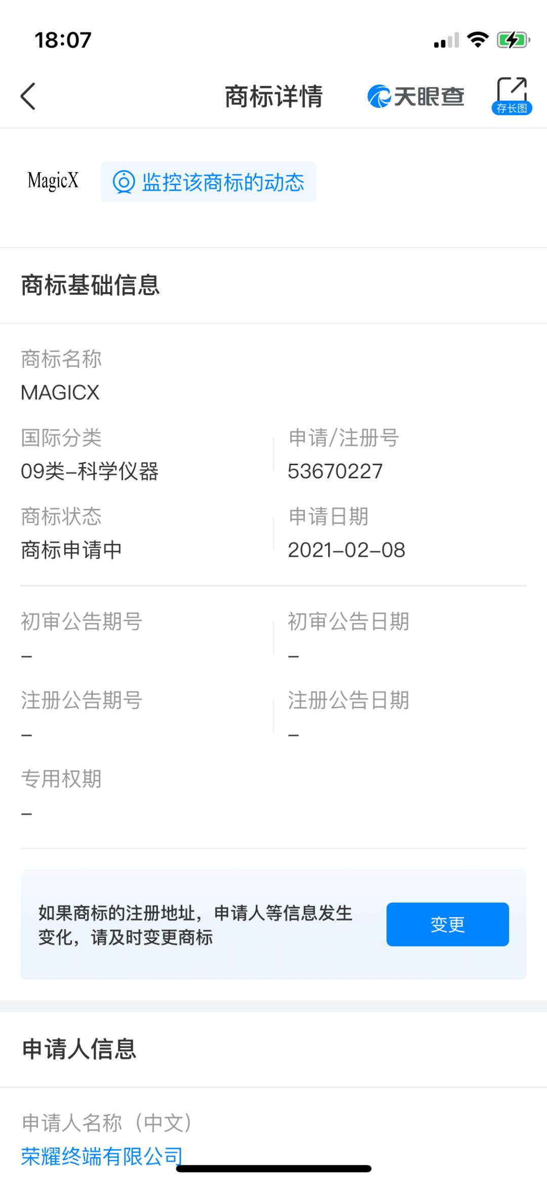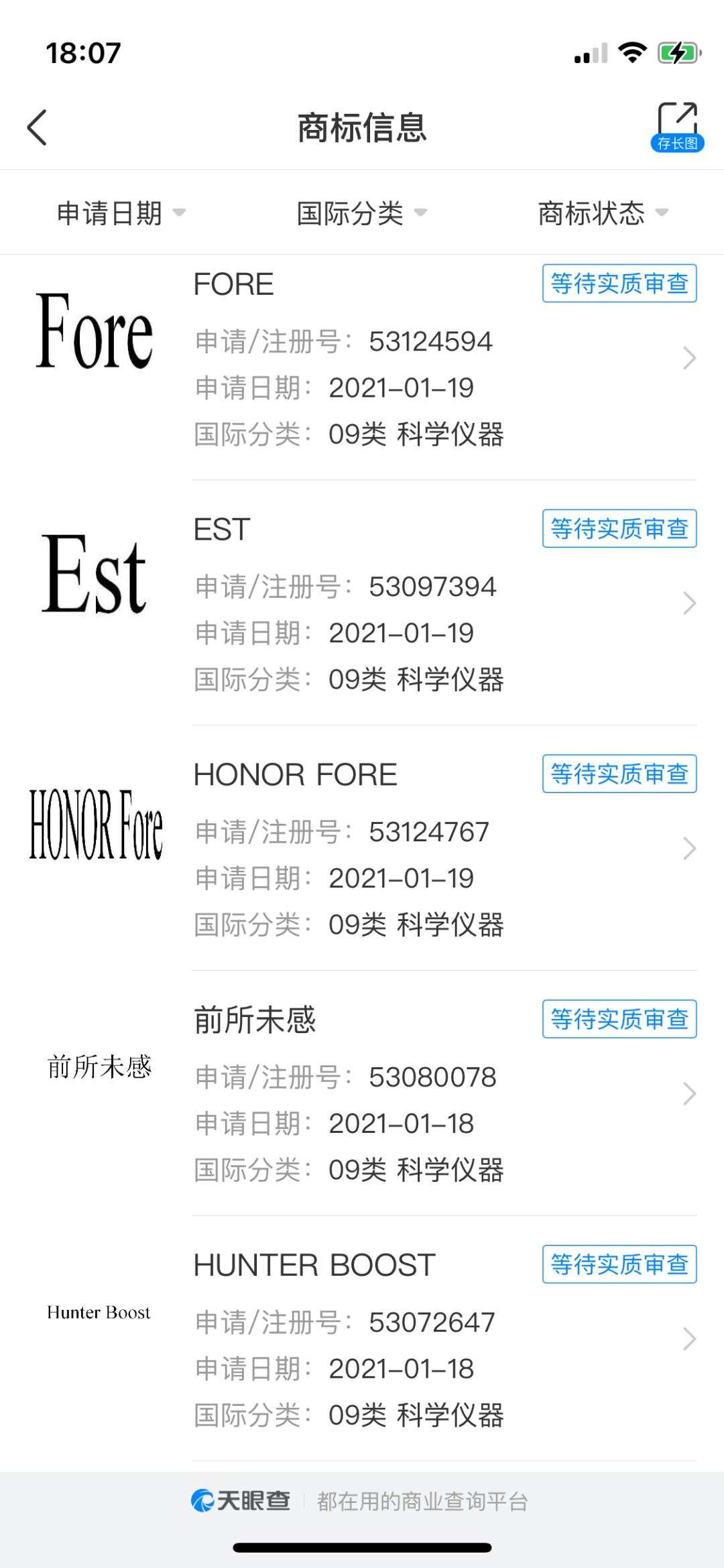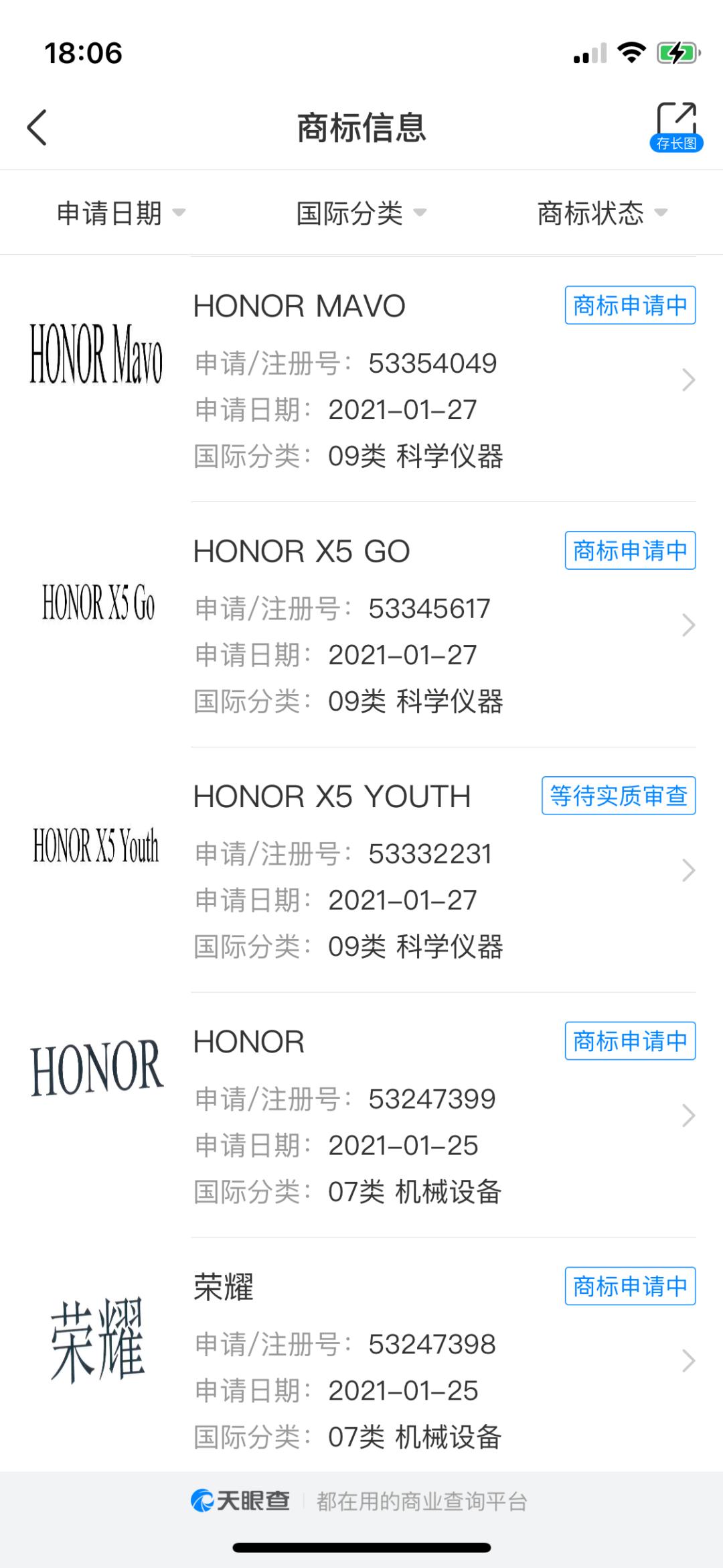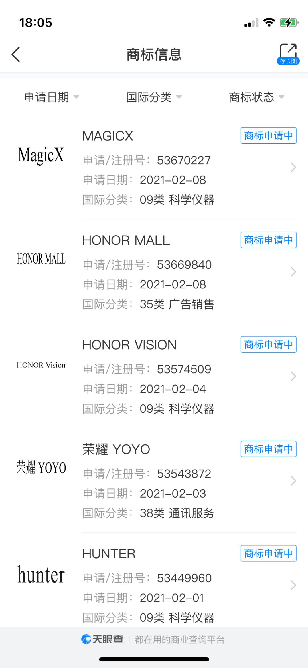 据不完全统计,荣耀申请的多个商标,包括:Magic X、HonOR Vision、HonOR Mall、HonOR Mega、HonOR Eva、HonOR Fore、HonOR Est、HonOR Mavo、HonOR X5 Go、Hunter Boost等等。