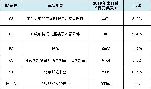 所谓的订单回流,市场理解的就是印度的主要贸易合作伙伴将订单转入到中国下达,但具体纺织行业占印度总出口额的比例又是多少?有一组数据显示,2019年,印度主要出口商品构成来看,印度的主要出口商品有矿产品、化工产品和贵金属及制品,其中出口的第11类纺织品及原料总计金额35502百万美元,占印度总出口额的11%。