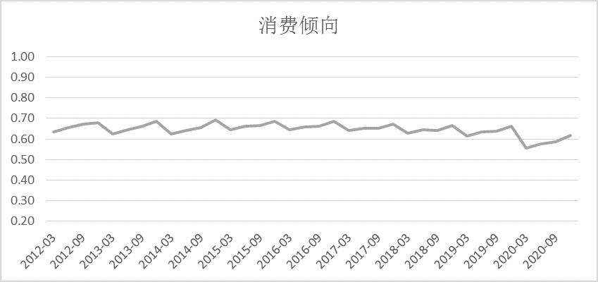 首先,居民支出与居民收入之间存在稳定关系。如果把居民支出/居民收入称为居民消费倾向,从图18可以看出,十年以来,我国城市居民的消费倾向始终在0.6-0.7之间。受疫情影响,该数值有短暂的下跌,目前又回到了0.6以上。