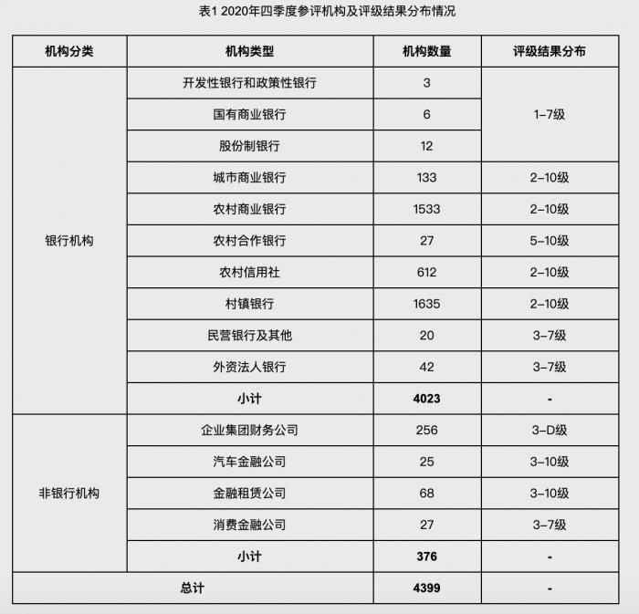 4399家参评机构中包含大型银行24家、中小银行3999家、非银行机构376家。