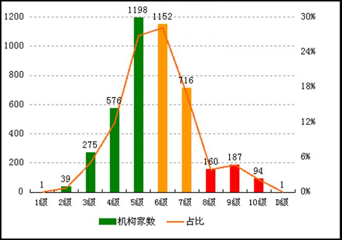 从整体上看,大部分机构评级结果在安全边界内(1-7级),资产占比98%。评级结果在“绿区”(1-5级)的机构2089家。“黄区”(6-7级)机构1868家。“红区”(8-D级)机构442家,资产占银行业的2%。“红区”机构较上季度减少132家,较去年同期减少103家。