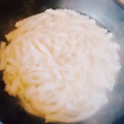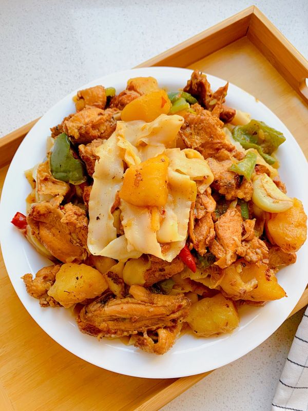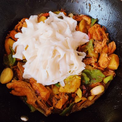 10、出锅的时候放入香油和花椒油,把宽面放入大盘鸡里,用汤汁拌一下