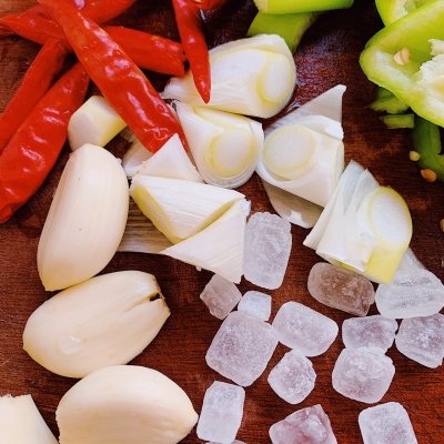 2、准备葱,干辣椒,蒜,花椒,八角,冰糖