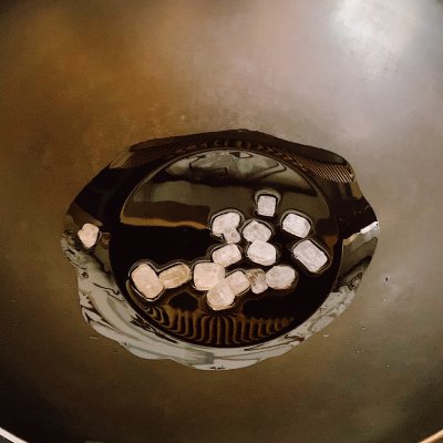 3、锅内热油,加入冰糖煮化,火不能太大,免得冰糖煮黑