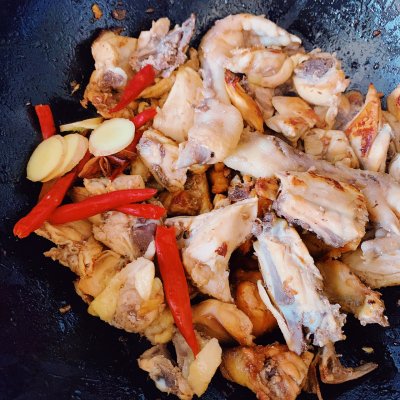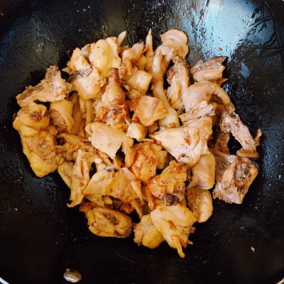4、加入鸡肉翻炒,炒至鸡肉变色