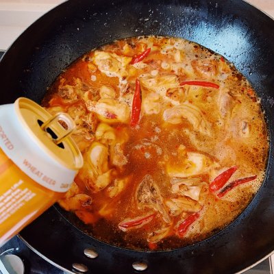 6、倒入啤酒和清水,基本没过鸡肉就可以了