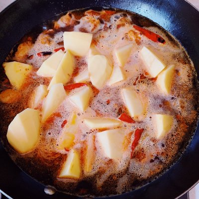 7、之后加入土豆,盐,鸡精,胡椒粉,盖上盖子后焖煮18分钟左右