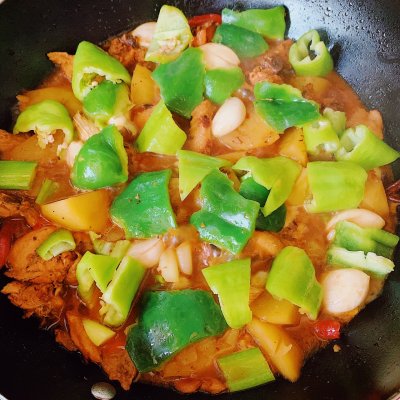 8、汤汁还剩三分之一的时候,下入大葱,拍扁的大蒜(蒜不要拍碎),下入青椒