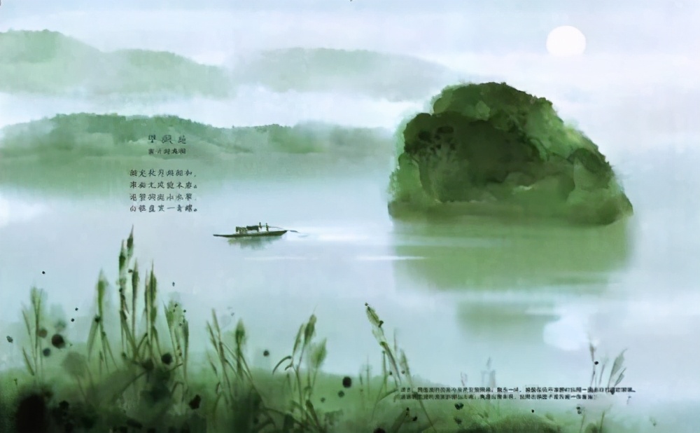 秋高气爽,初月高悬,漾漾的湖光与溶溶的月光融合在一起,宛如在合奏一曲天籁之音。没有一丝轻风吹拂,辽阔无际的洞庭仍涟漪微微,就像一面尚未擦拭的巨大铜镜,迷迷蒙蒙。此时,水天一色,玉宇无尘,整个大地空濛迷离,显得那么宁静,那么美好。