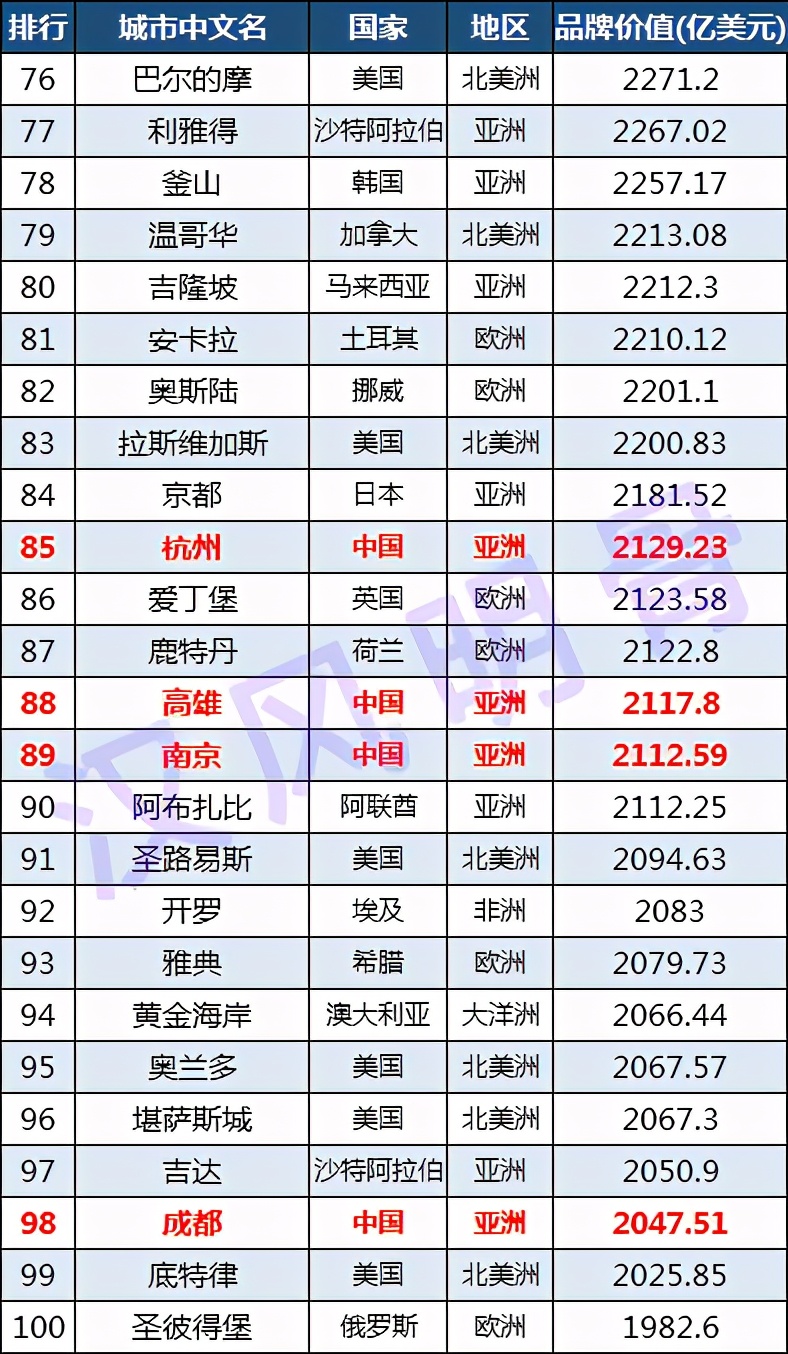 吉隆坡排名第80,南京排名第89,阿布扎比排名第90,圣彼得堡排名第100;