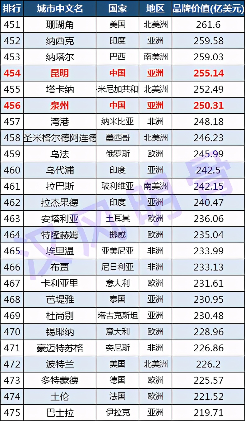 伯尔尼排名第442,第戎排名第450,昆明排名第454,泉州排名第456;