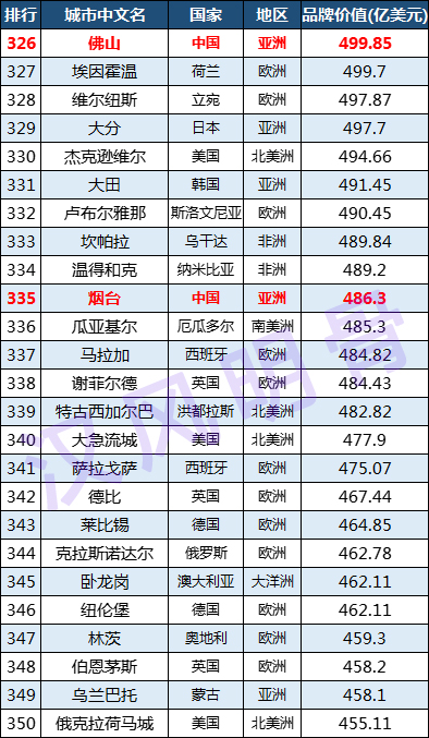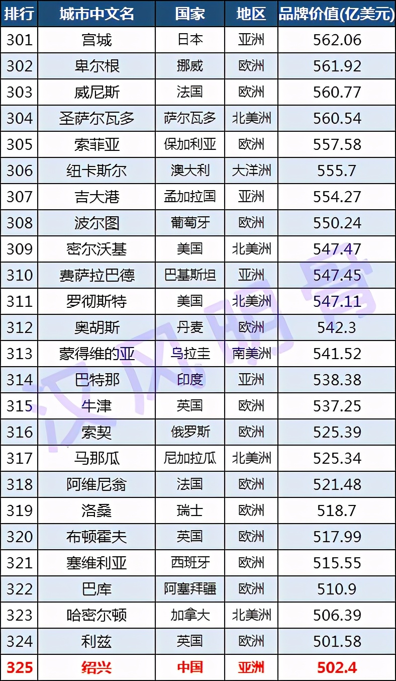 费萨拉巴德排名第310,布顿霍夫排名第320,绍兴排名第325,佛山排名第326;