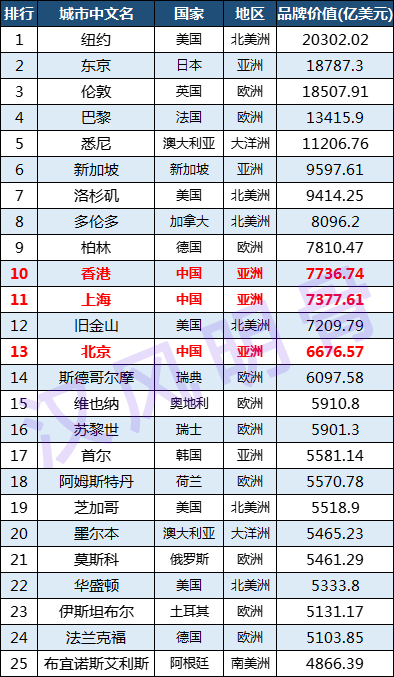 具体来看的话,美国的纽约城市品牌价值高达20302亿美元,是世界第一大城市,也是全球唯一品牌价值超过2万亿美元的城市;东京、伦敦、巴黎、悉尼四座城市的品牌价值均超过1万亿元,依次排名第二至第五;新加坡、洛杉矶、多伦多、柏林、香港五座城市的品牌价值介于7500—10000亿美元之间,也跻身世界十强城市,排名第十的香港,是我国排名最高的城市。