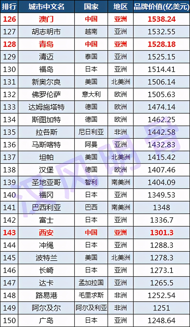 福岛排名第130,福冈排名第140,西安排名第143,广岛排名第150;