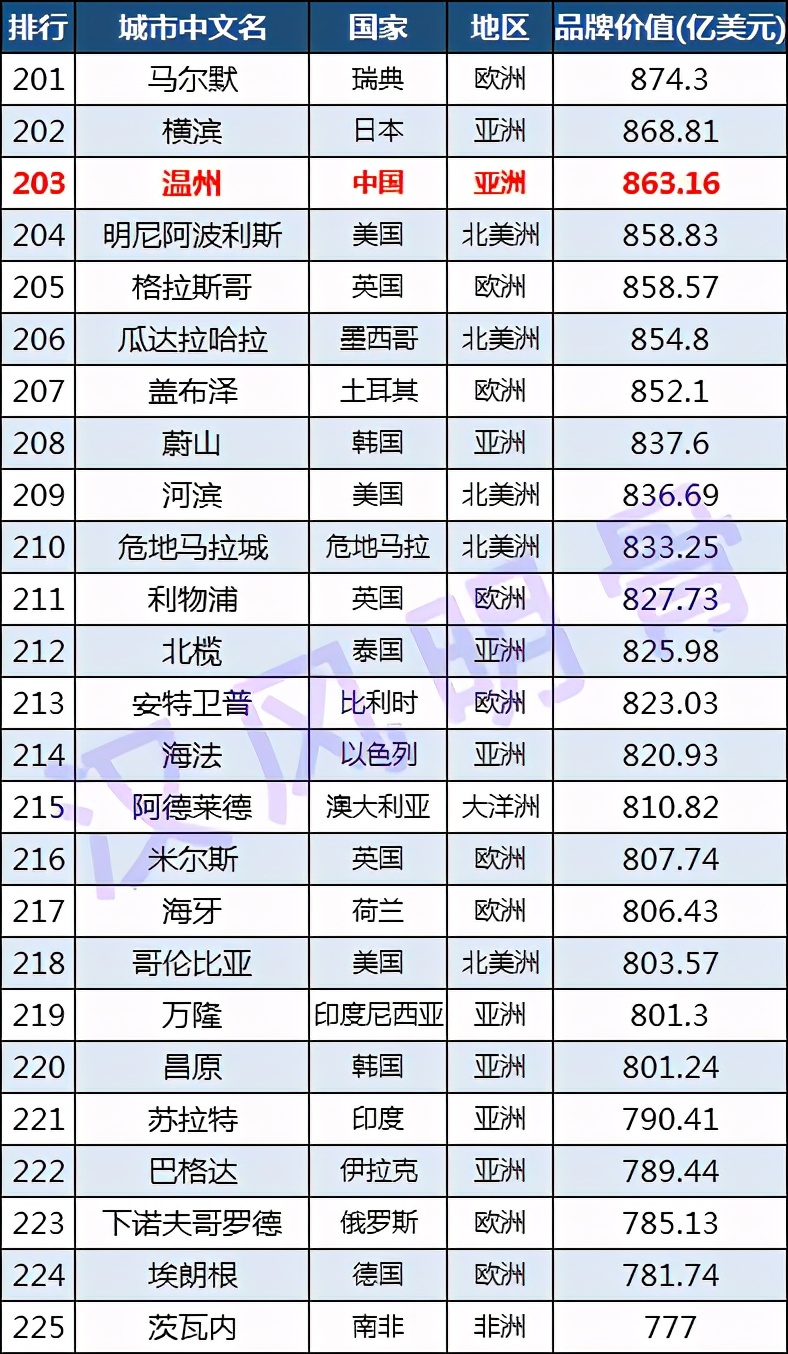 温州排名第203,危地马拉城排名第210,昌原排名第220,无锡排名第230;