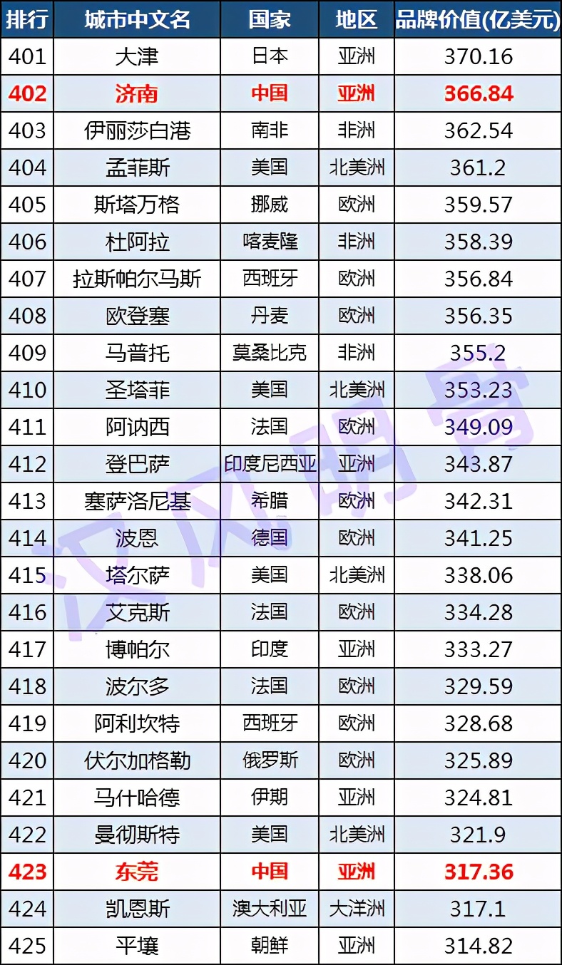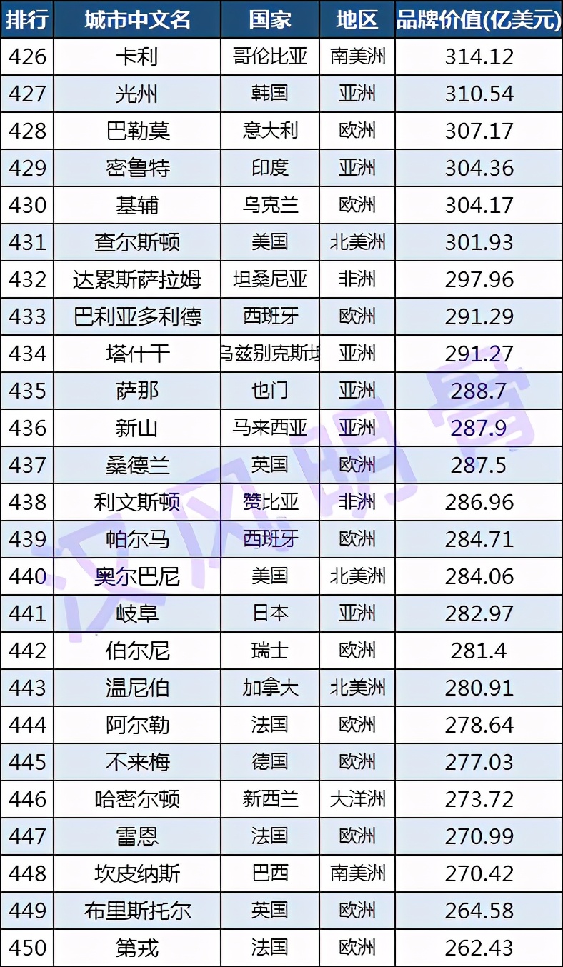 伏尔加格勒排名第420,东莞排名第423,基辅排名第430,奥尔巴尼排名第440;