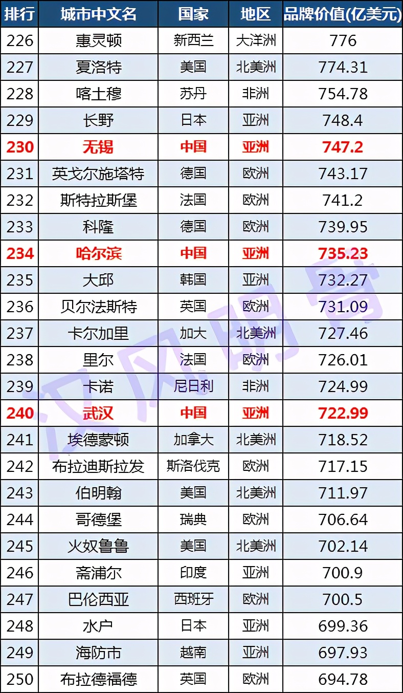 哈尔滨排名第234,武汉排名第240,布拉德福德排名第250,大连排名第254;