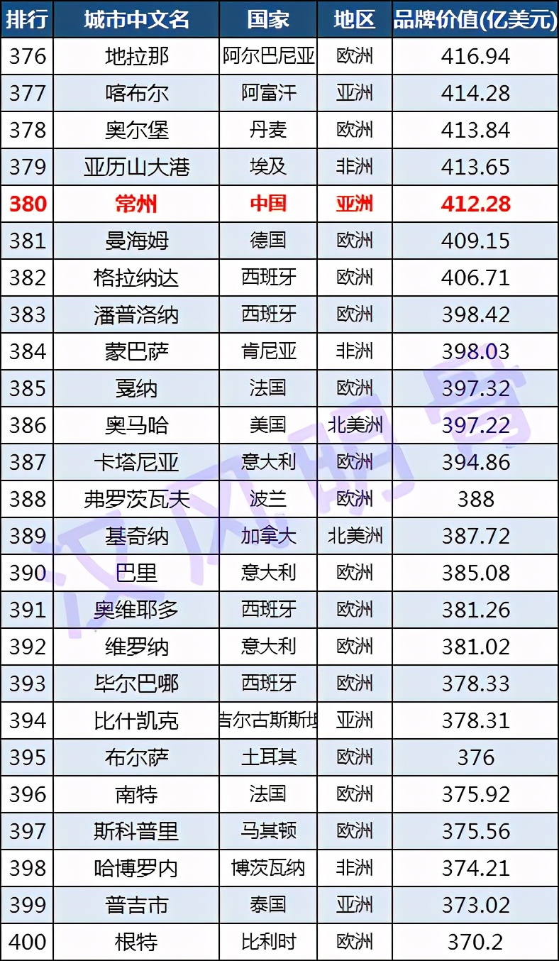 韦克菲尔德排名第360,沈阳排名第368,哈拉雷排名第370,常州排名第380;