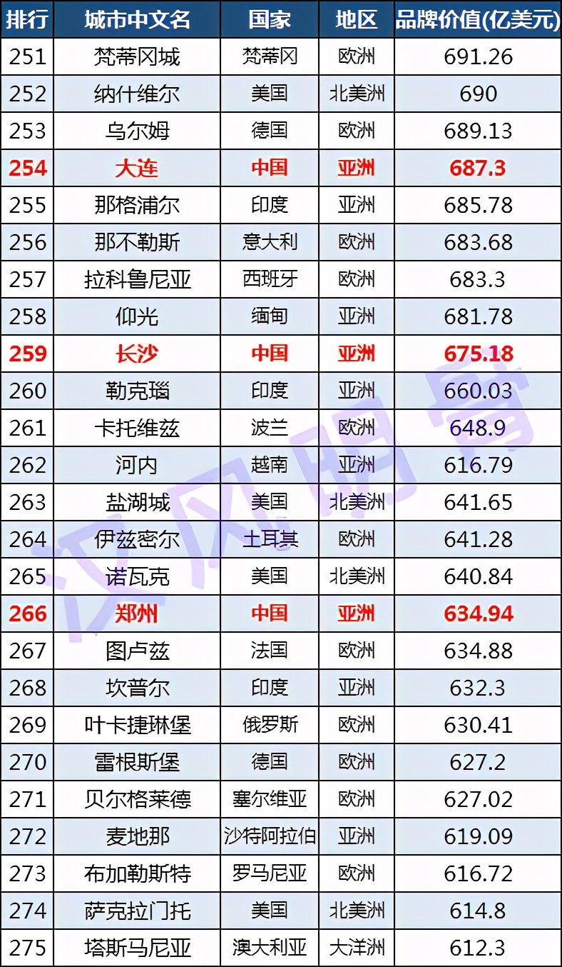 长沙排名第259,勒克瑙排名第260,郑州排名第266,雷根斯堡排名第270;