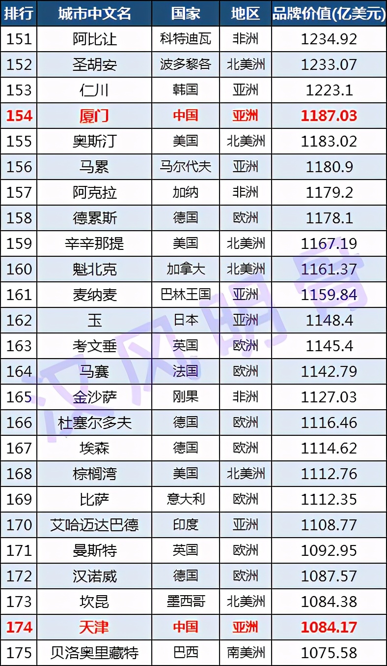 厦门排名第154,魁北克排名第160,艾哈迈达巴德排名第170,天津排名第174;