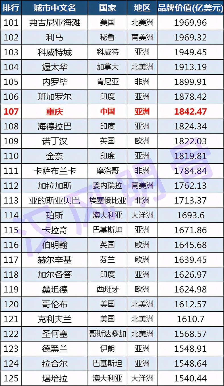 重庆排名第107,金奈排名第110,哥伦布排名第120,青岛排名第128;